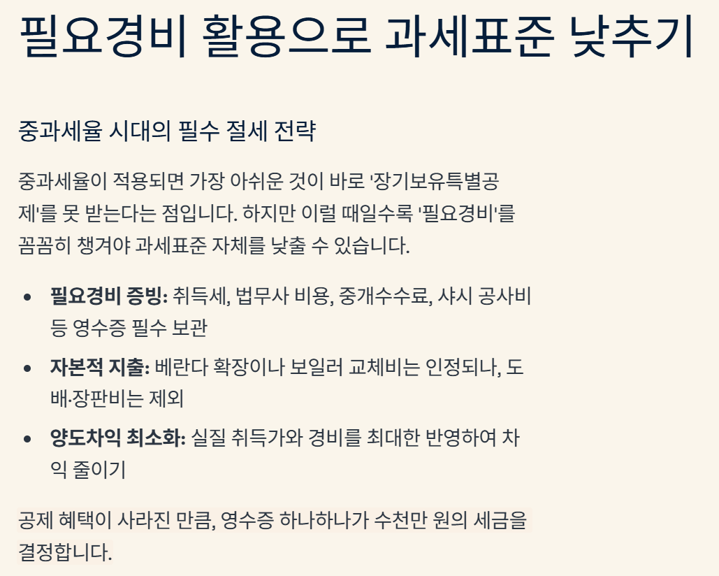 중과세율이 적용되면 가장 아쉬운 것이 바로 '장기보유특별공제'를 못 받는다는 점입니다. 하지만 이럴 때일수록 '필요경비'를 꼼꼼히 챙겨야 과세표준 자체를 낮출 수 있습니다. ⚠️