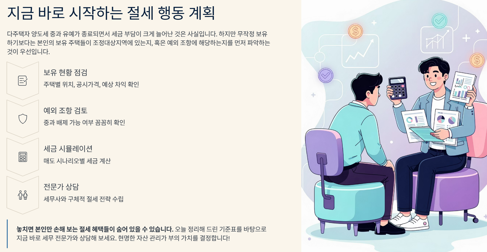 다주택자 양도세 중과 유예가 종료되면서 세금 부담이 크게 늘어난 것은 사실입니다. 하지만 무작정 보유하기보다는 본인의 보유 주택들이 조정대상지역에 있는지, 혹은 예외 조항에 해당하는지를 먼저 파악하는 것이 우선입니다.