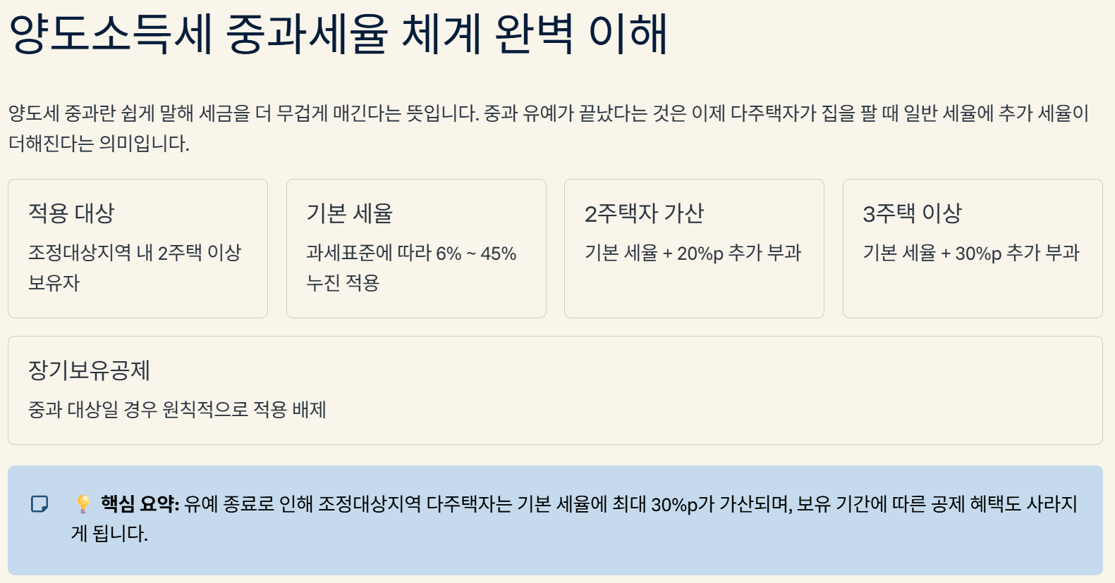 양도세 중과란 쉽게 말해 세금을 더 무겁게 매긴다는 뜻입니다. 중과 유예가 끝났다는 것은 이제 다주택자가 집을 팔 때 일반 세율에 추가 세율이 더해진다는 의미입니다.