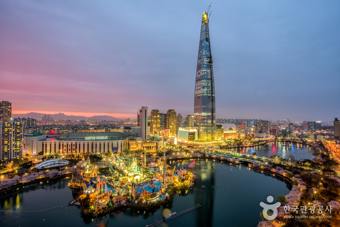 - 롯데월드타워를 배경으로 벚꽃 사진을 남기기 딱 좋은 명소