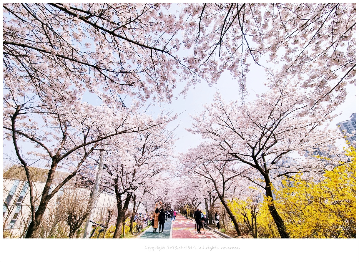 - 벚꽃과 개나리가 함께 어우러진 산책로, 감성 넘치는 풍경