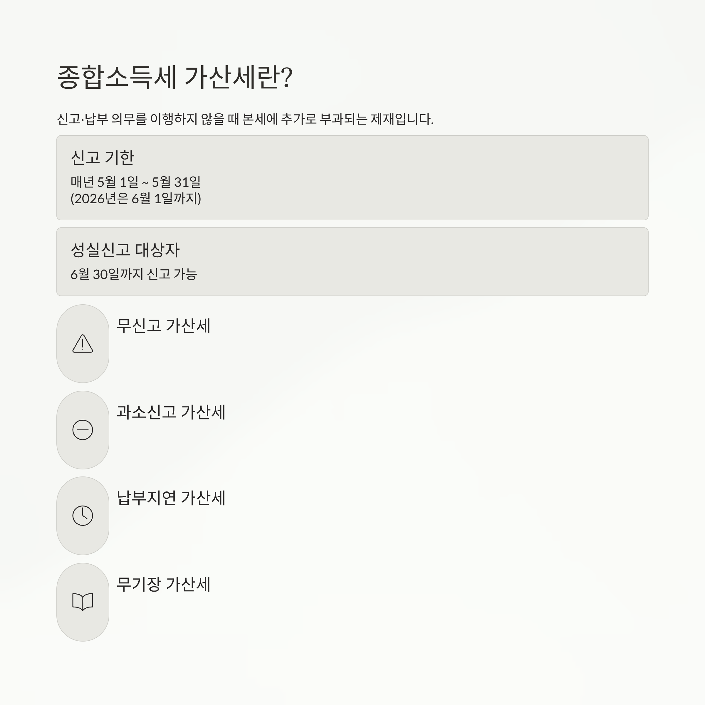 가산세는 세법에서 정한 신고·납부 의무를 이행하지 않았을 때 본세에 추가로 부과하는 제재입니다. 종합소득세 신고 기간은 매년 5월 1일부터 5월 31일까지이며, 성실신고확인 대상 사업자는 6월 30일까지입니다.