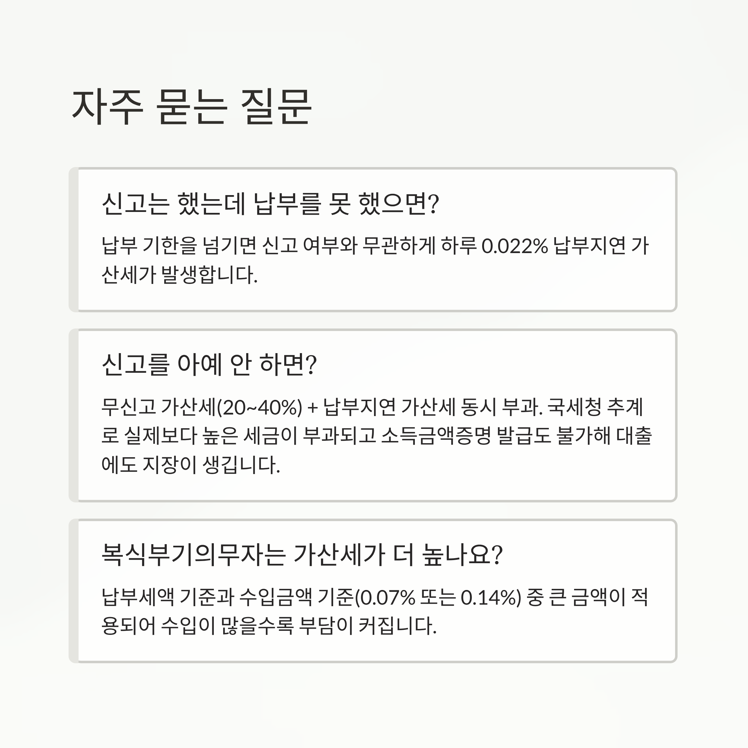 본 글은 작성 시점 기준의 정보를 제공하며, 정부 정책 및 세법 기준은 변경될 수 있습니다. 정확한 가산세 계산 및 신고 방법은 국세청 홈택스(www.hometax.go.kr) 또는 담당 세무사에게 직접 문의하여 최신 정보를 확인하시기 바랍니다.