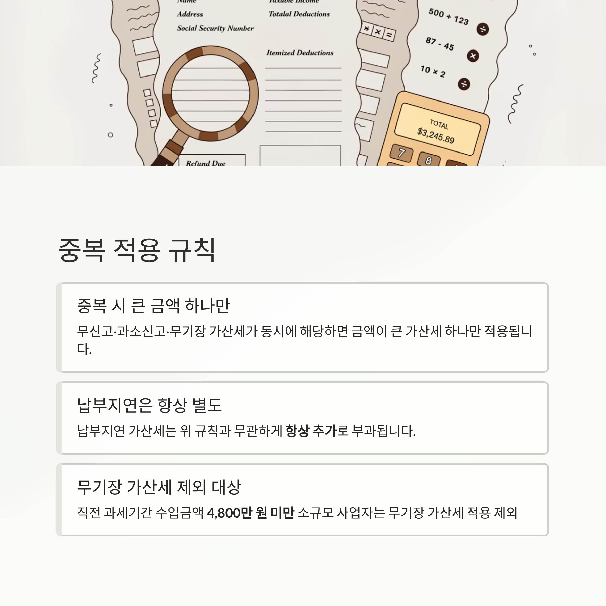 무신고 가산세, 과소신고 가산세, 무기장 가산세가 동시에 해당하는 경우 금액이 큰 가산세 하나만 적용됩니다. 단, 납부지연 가산세는 항상 별도로 추가됩니다.