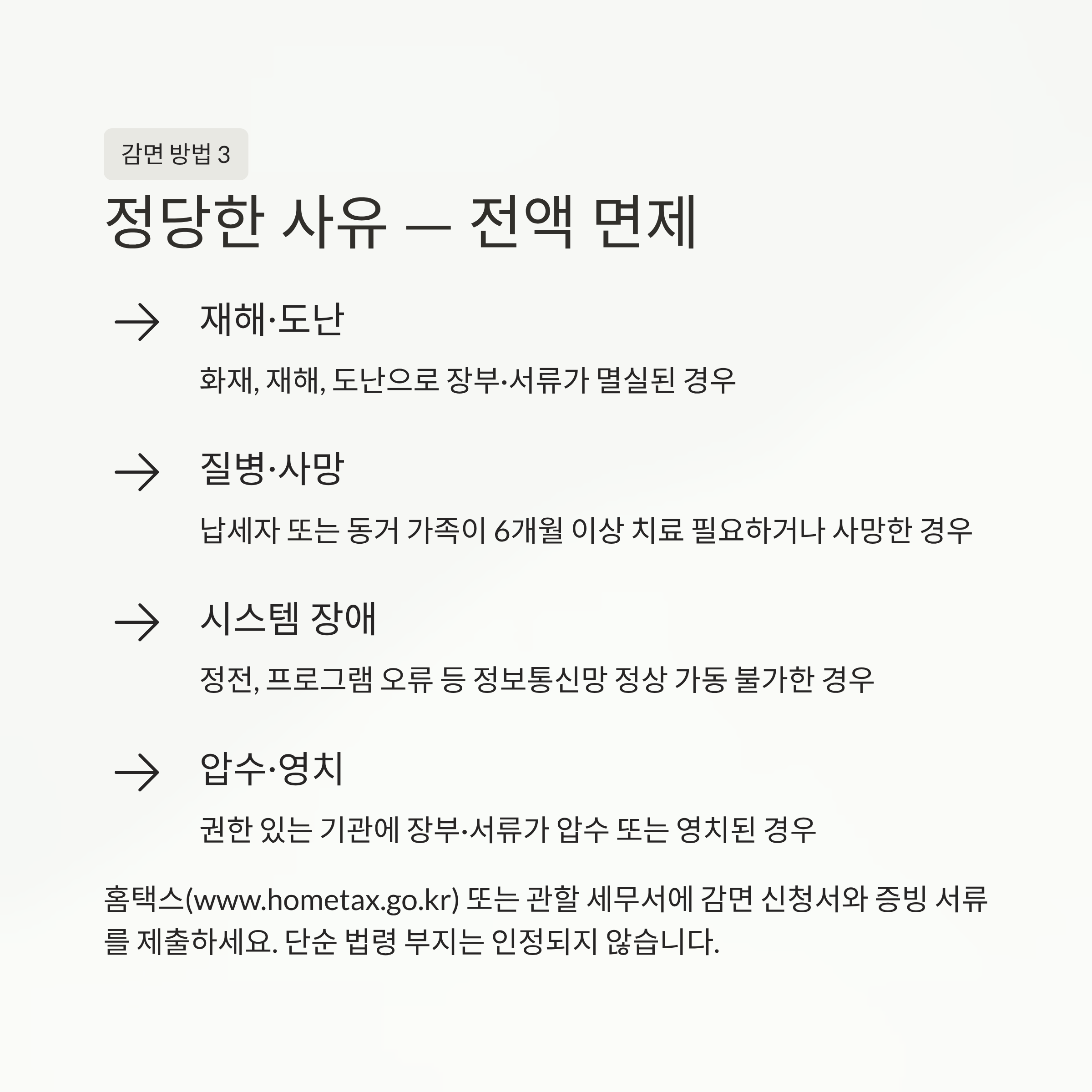 면제 사유가 있는 경우 홈택스(www.hometax.go.kr) 또는 관할 세무서에 가산세 감면 신청서를 제출하면 됩니다. 재해·질병 등 증빙 서류를 함께 첨부해야 합니다. 단순한 법령 부지나 오해는 정당한 사유로 인정되지 않습니다.
