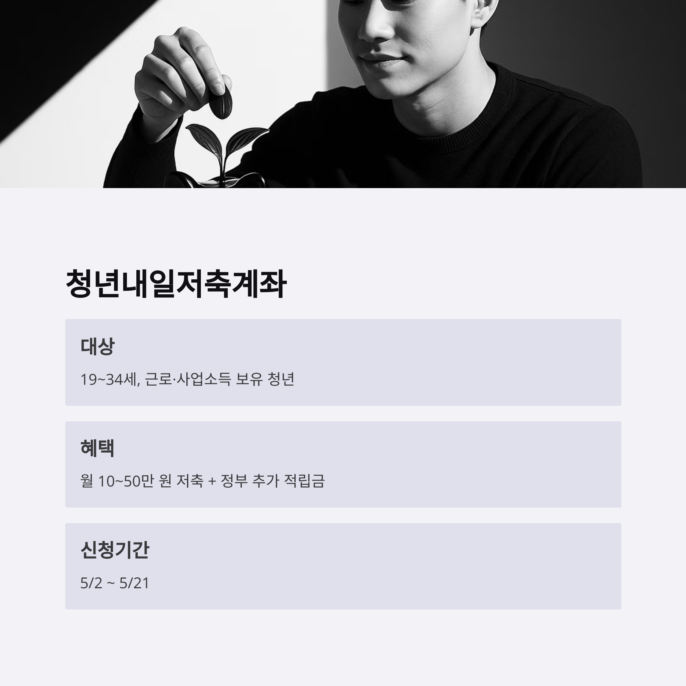 | 청년내일저축계좌 | 19~34세, 근로·사업소득 보유 | 월 10~50만 원 + 정부 지원 | 5/2 ~ 5/21 |
