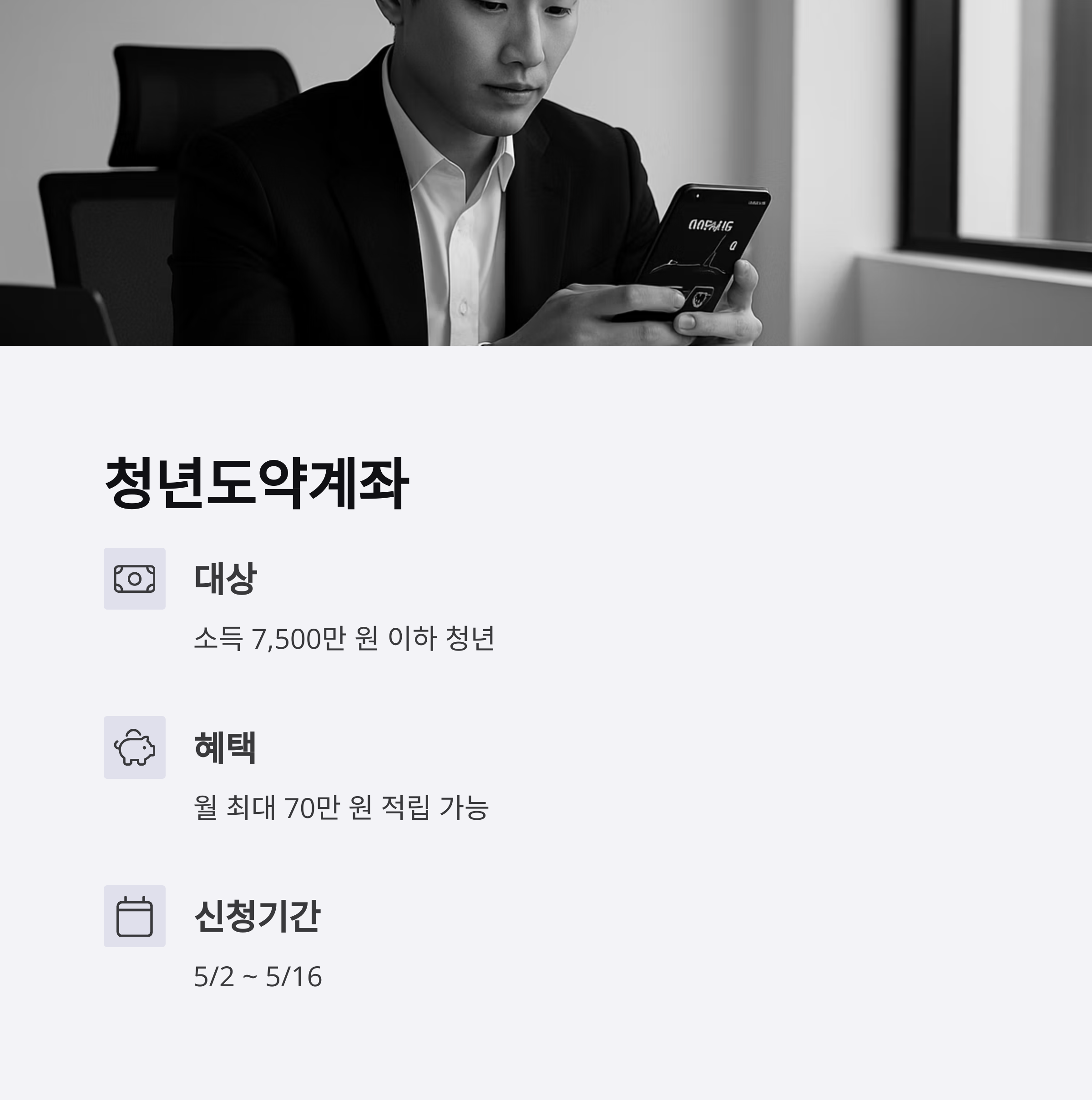| 청년도약계좌 | 소득 7,500만 원 이하 청년 | 월 최대 70만 원 적립 | 5/2 ~ 5/16 |