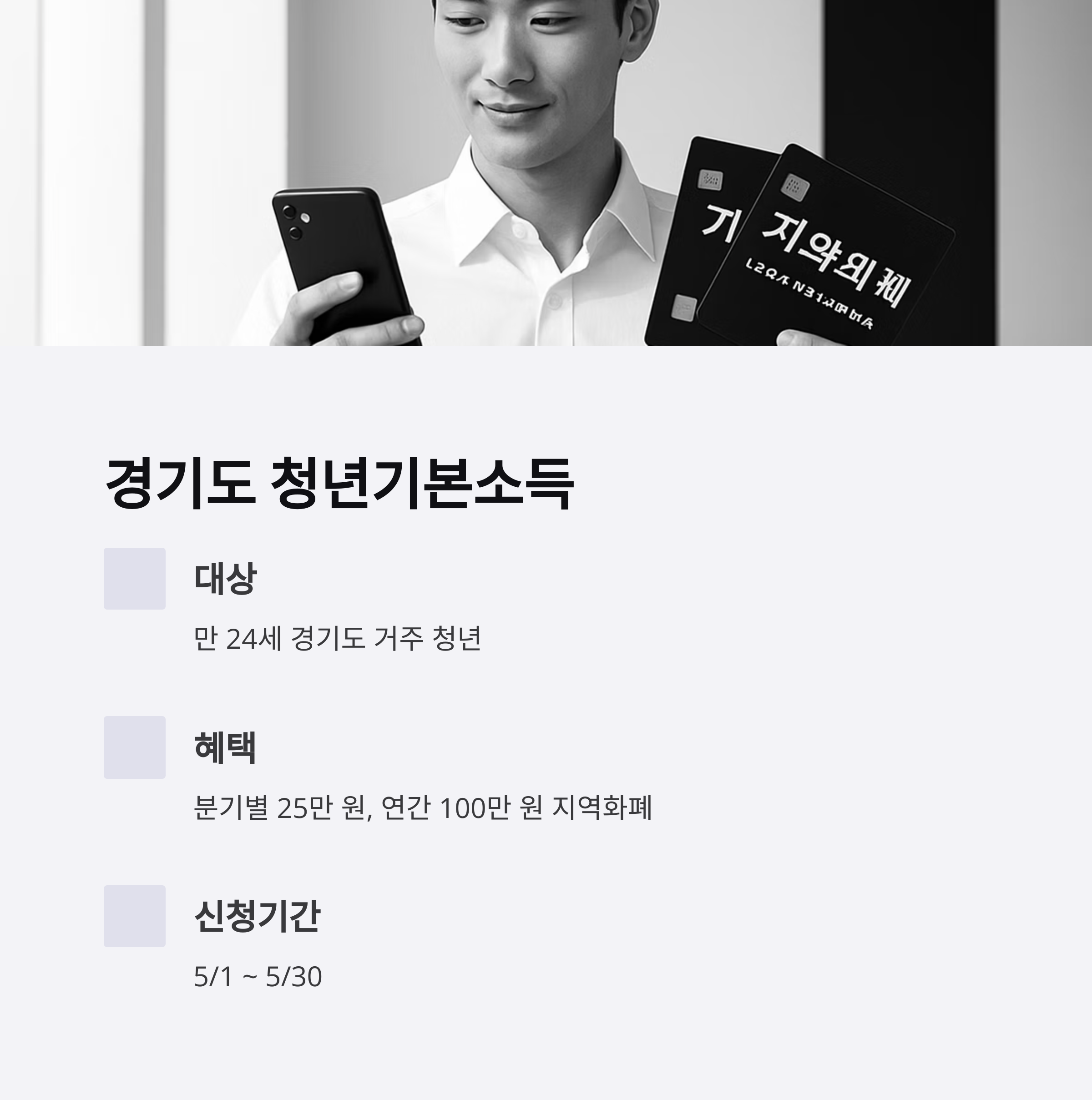 | 경기도 청년기본소득 | 만 24세 경기도 거주 청년 | 분기별 25만 원 지역화폐 | 5/1 ~ 5/30 |