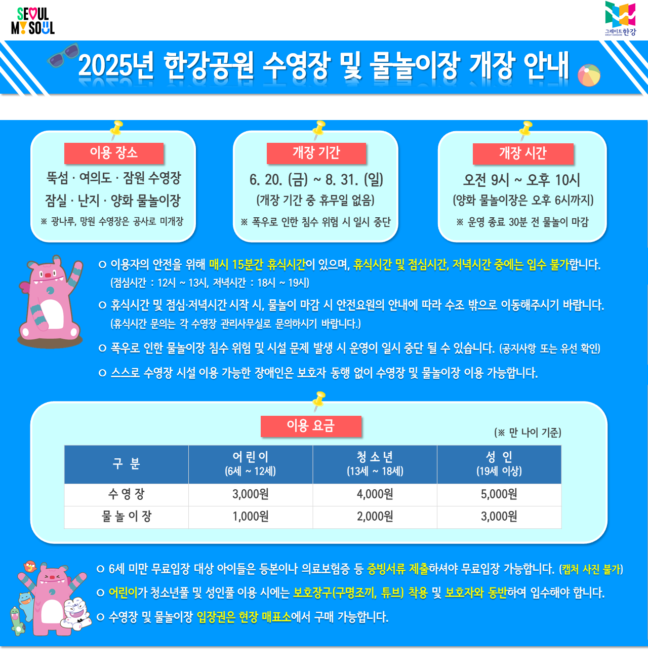 | 잠실 / 난지 물놀이장 | 6.20~8.31 (73일, 무휴) | 09:00~22:00 (점심·휴식 동일) |