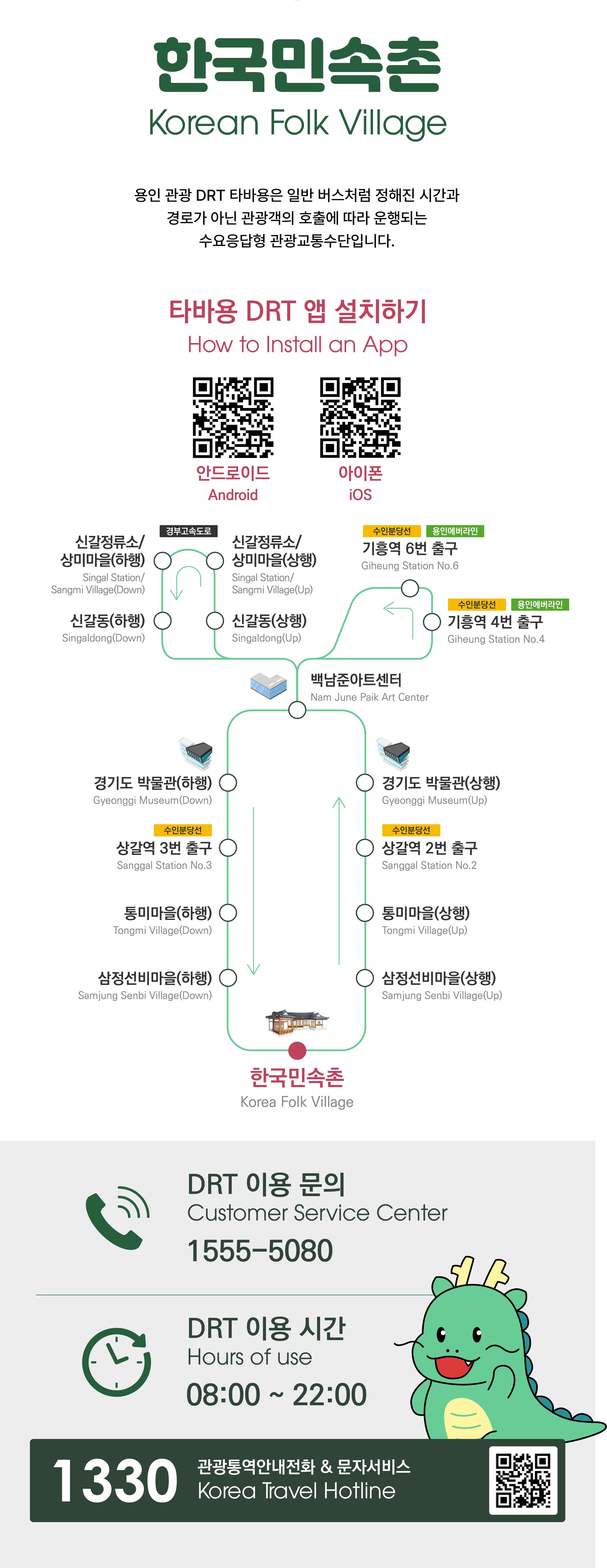 - 이용방법: ‘타바용’ 또는 ‘용인관광DRT’ 앱 설치 ➔ 정류장 호출