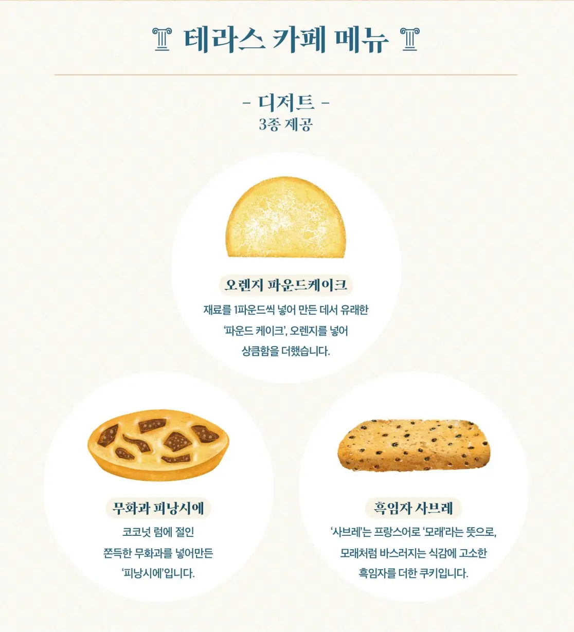 - 다과 구성: 오렌지 파운드케이크, 무화과 피낭시에, 흑임자 사브레