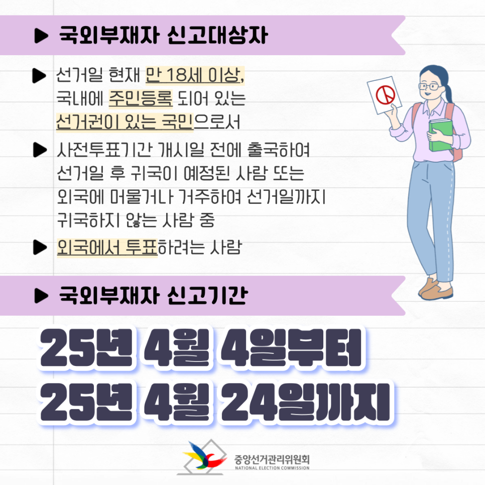 지금 바로 국외부재자 또는 재외선거인 등록을 완료하고, 2025 대선에 참여하세요!