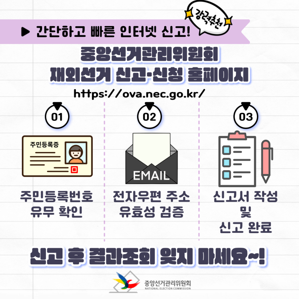 | 방법 | 온라인 신청 (https://ova.nec.go.kr) 또는 재외공관 방문 | |
